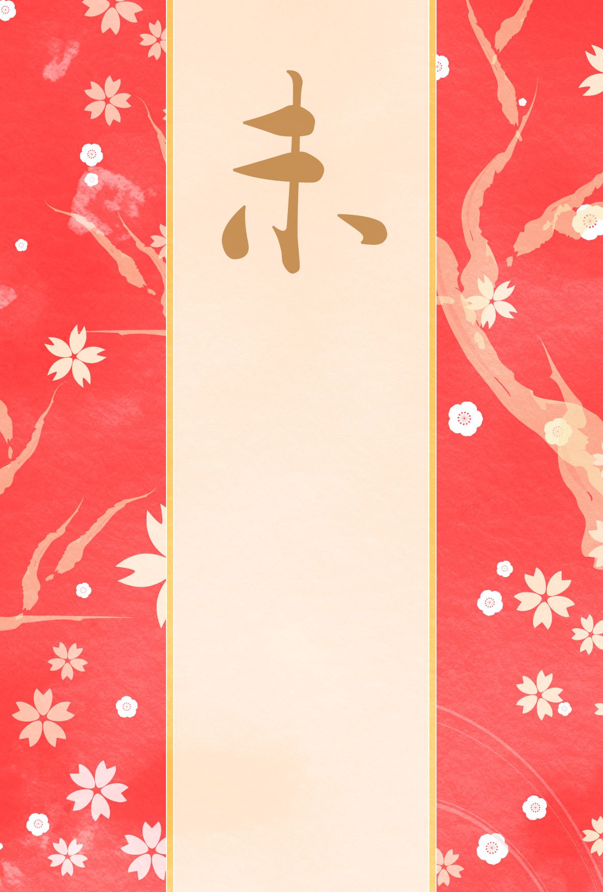 朱色の背景に桜に花びらをランダムに散らした春を感じさせるデザインです。