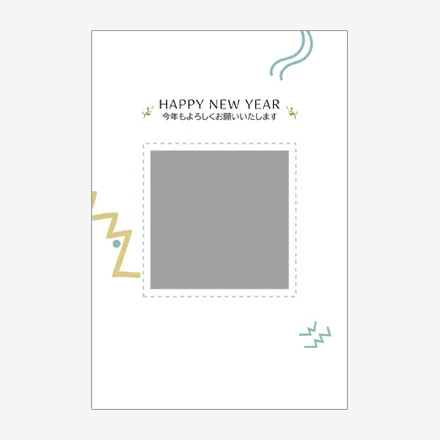 2027年(令和9年)の年始挨拶に。優しい色合いに「かわいい」イラストを使った、素敵な写真フレームデザインの年賀状テンプレートです。