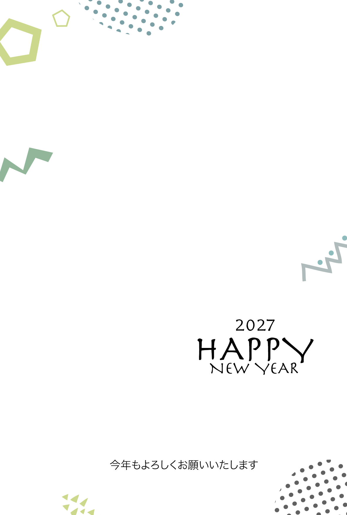 2027年(令和9年)の年始挨拶に。優しい色合いに「かわいい」イラストを使った、素敵な写真フレームデザインの年賀状テンプレートです。