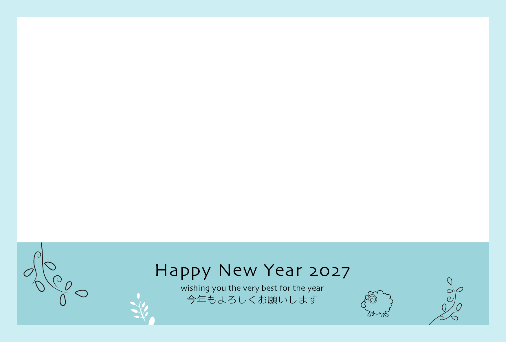 スモーキーブルーを使った「横」デザイン。小さく使ったリーフや羊のイラストが「おしゃれ」。「1枚の写真」を入れる事ができます。